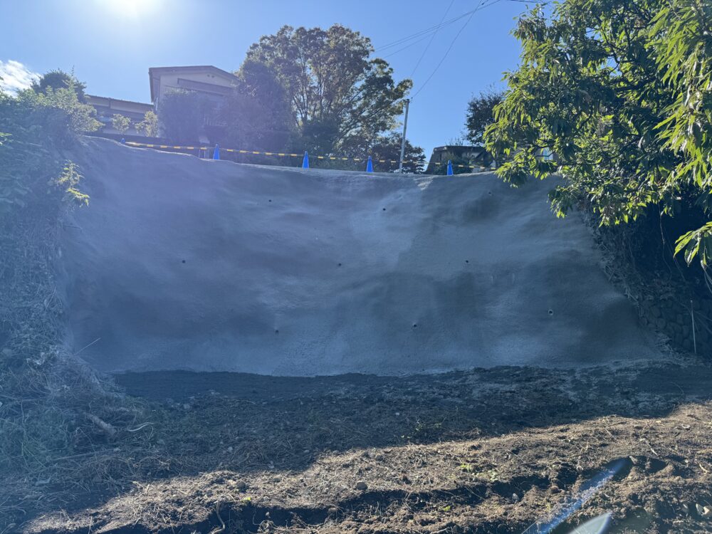 施工内容としては、約70㎡の範囲においてコンクリート工事および吹付モルタル工事を行います。コンクリートにより地盤の安定を図り、その上からモルタルを吹き付けることで、表面の保護と崩落防止を行います。